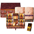 il est le meilleur cadeau pour vous.それはあなたのための最高の贈り物仏語…tresor(宝物) 伊語…dolce(スイーツ・デザート、甘美な・優しい)あなただけの大切な“宝物(Tresor)を見つけていただきたい”そんな思いから、こころを込めてお贈りいたします。カラフルでほんのり香るフルーツバウムは全部で4種類。メロン・ラズベリー・バナナ・ショコラ。フランス生まれの洋菓子、ラングドシャをセットにTresore Dolce(トレゾアドルチェ)が自信を持ってお届けいたします。ラングドシャ[仏語] langue de chat・・・「猫の舌」の意。ラングドシャとは、卵黄を使わず、小麦粉に卵白・バター・砂糖などを加えて焼いた、薄くてサクッと軽やかなクッキー。プレーンラングドシャ・・・チョコクリームをサンド。チョコラングドシャ・・・ホワイトクリームをサンド。美味しさと華やかさ、ひとつに。トレゾア ドルチェの“宝石箱”は、その豪華なギフトボックスも人気の秘密。お菓子を召し上がったあとにも小物入れとしてお使いいただけます。今治産タオルを加え、『美味しさと華やかさ、ひとつに。』大切な方へのプレゼントに、お土産に、ご自宅用に。お日持ち1ヶ月程度ございますので各種ご贈答にどうぞご利用ください。