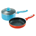 内面はマーブルフッ素樹脂加工でお手入れ簡単。アルミ製なので軽量で調理の負担になりにくい。ツマミ・ハンドル部はシリコン樹脂塗装で、すべりにくく手になじみます。