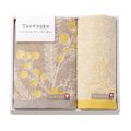 ミモザのふわふわやわらかな黄色の花がかわいらしいタオル。ミモザの花をふんだんにあしらったタオルはタオルの産地、今治で織られ吸水性も抜群。やわらかでナチュラルな黄色と落ちついたグレーベージュのデザインはどんなお部屋にも馴染み、インテリアにもぴったりです。
