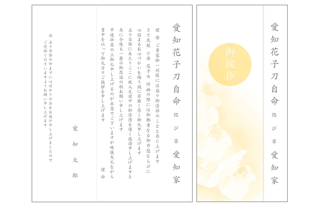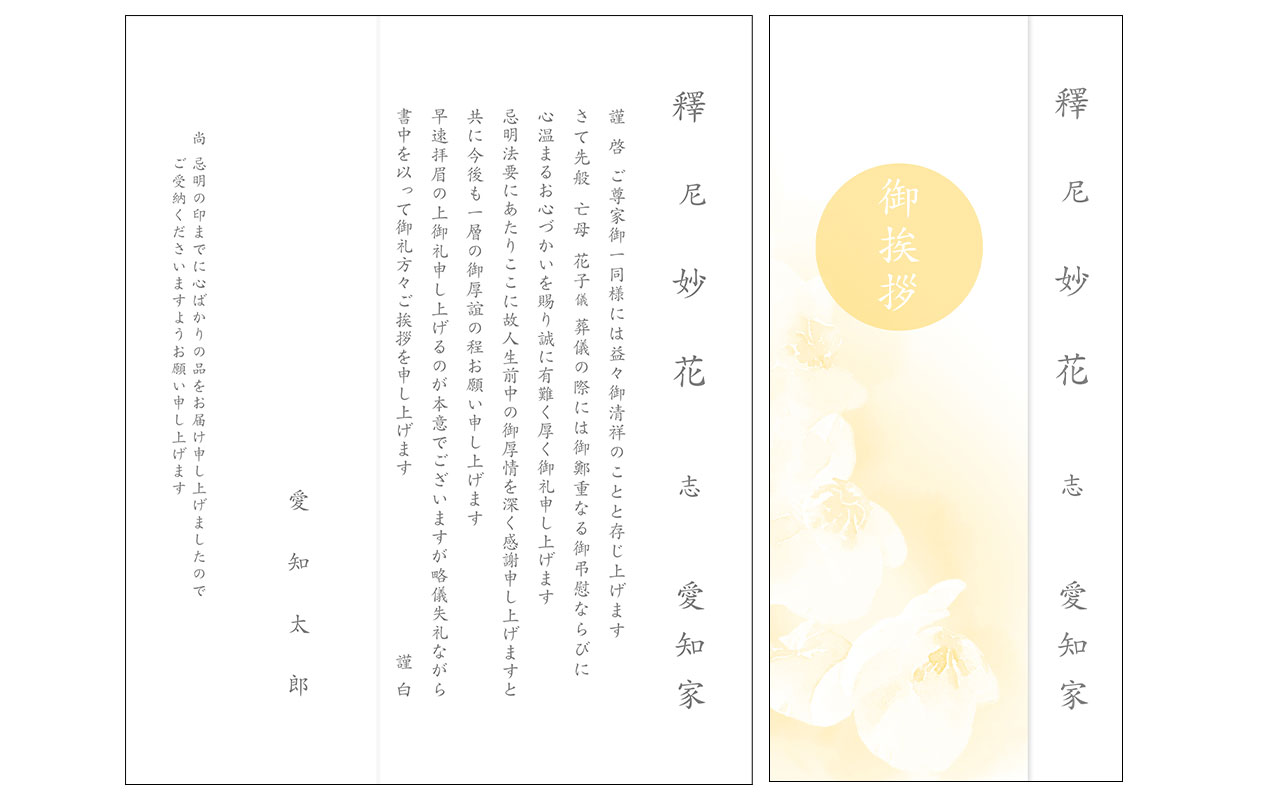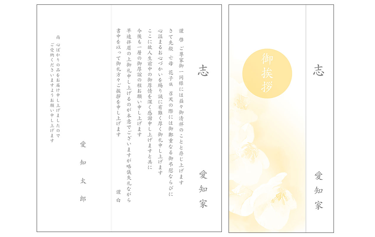これらに適した文章の雛形を元に、戒名・故人名・家名等をメール等で確認させていただきながら、香典返しに適した挨拶状を作成致します。定型文(カードタイプ)もご用意できます。弔事の礼状では、故人を偲ぶ気持ちとご遺族の悲しみを表すために、薄墨色の文字を用います。